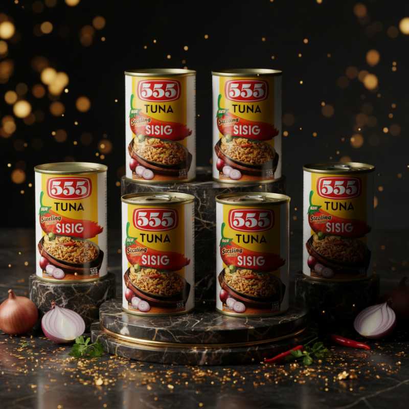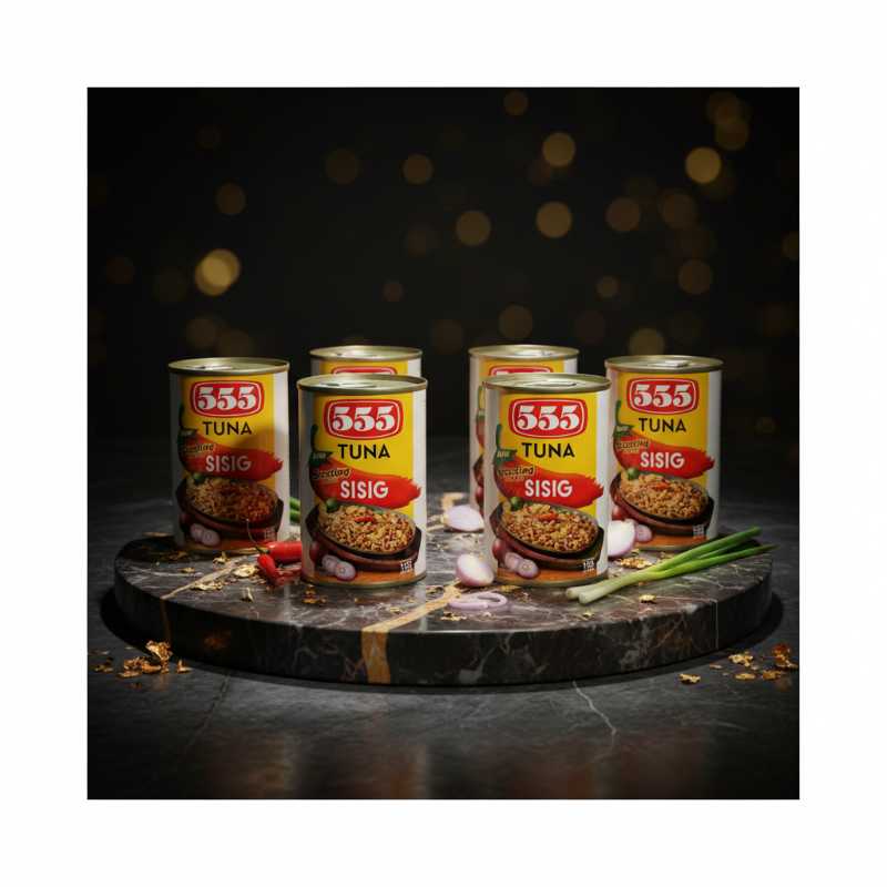 * **Brand:** 555 * **Product Type:** Canned Tuna * **Flavor:** Sizzling Sisig (Filipino-inspired) * **Key Feature:** “New Sizzling” recipe * **Weight:** 155g (Assumed net weight) * **Convenience:** Ready-to-eat, ideal for quick meals or snacks * **Cuisine:** Authentic Filipino flavor profile