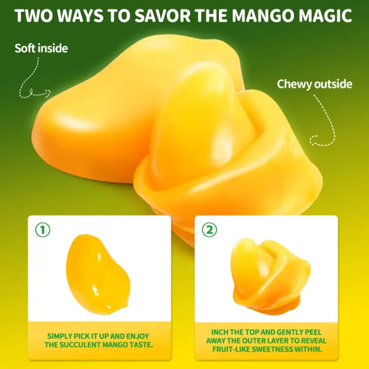 - Realistic Mango Shape with Glutinous Taste: Indulge in the unique shape of a mango candy that boasts a delightful glutinous texture, adding to the sensory delight.