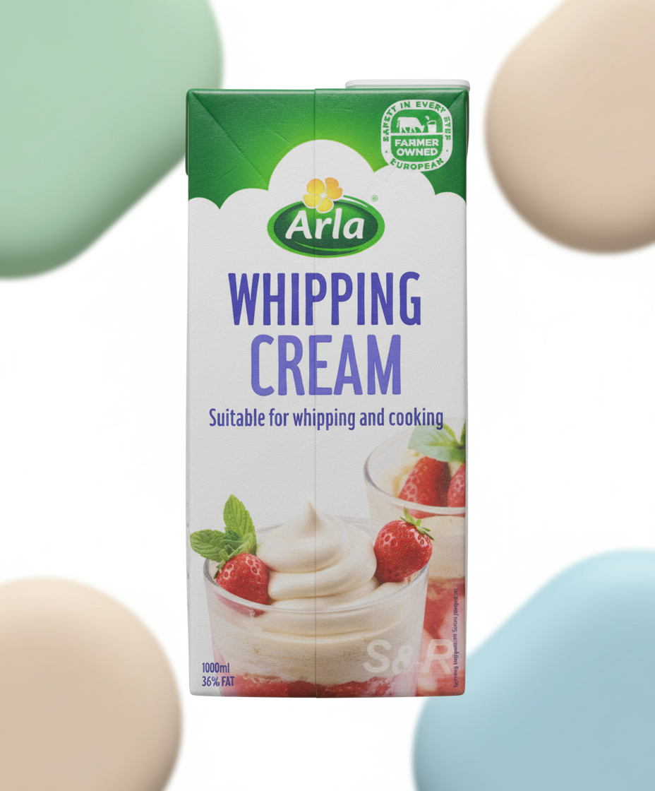 * **Premium Quality:** Arla Whipping Cream is made from high-quality milk, ensuring a rich and creamy texture. * **Versatile Dairy Product:** Perfect for whipping into light, airy peaks for desserts or adding a smooth, rich finish to sauces and soups. * **Farmer Owned:** Produced by Arla, a farmer-owned dairy cooperative committed to quality and sustainability. * **Multi-Purpose Use:** Clearly labeled as ‘Suitable for whipping and cooking,’ making it a versatile staple for any kitchen. * **Convenient Packaging:** Packaged in a durable and easy-to-store carton to maintain freshness.