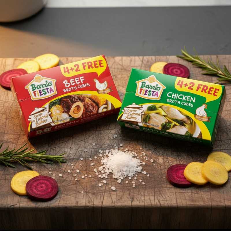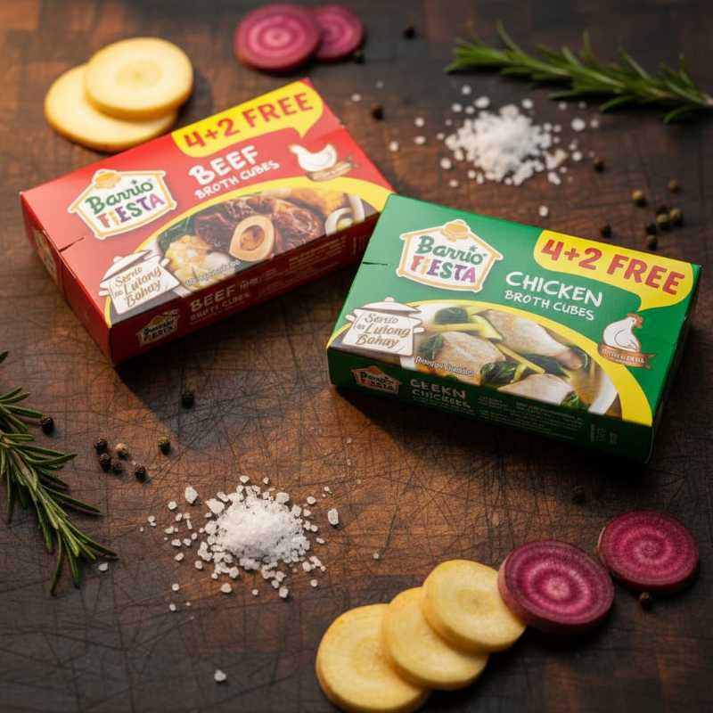 * Dual Pack: Includes one box of Barrio Fiesta Beef Broth Cubes and one box of Barrio Fiesta Chicken Broth Cubes. * High Value Offer: Both boxes feature a ‘4 + 2 FREE’ promotion, maximizing the number of cubes per purchase. * Versatile Flavor Enhancer: Ideal for enriching the taste of savory dishes like sinigang, nilaga, stews, sauces, and rice. * Authentic Filipino Kitchen Staple: Essential bouillon for adding a quick, robust flavor base to your cooking. * Convenient Cube Format: Easy to dissolve and measure for consistent flavor results.