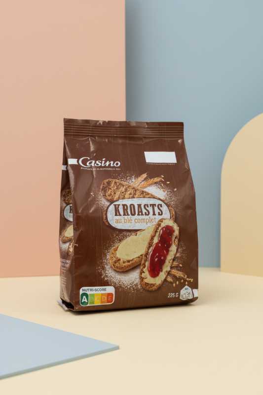 * Authentic Casino brand toasted bread slices (KROASTS). * Crispy, light texture, perfect for breakfast or snacking. * Ideal accompaniment for both sweet toppings (jam, honey) and savory spreads (pâté, cheese). * Convenient packaging to maintain freshness. * Features a visible Nutri-Score rating for nutritional transparency.