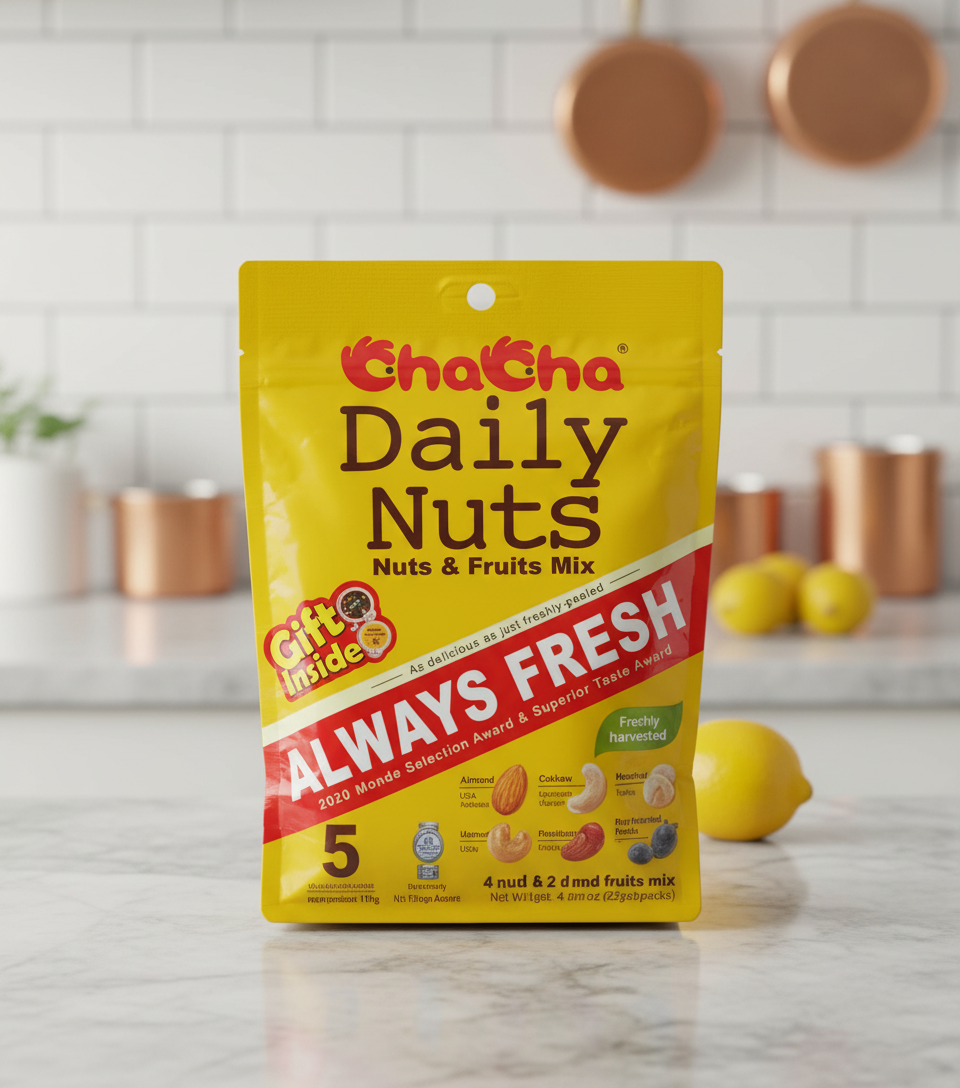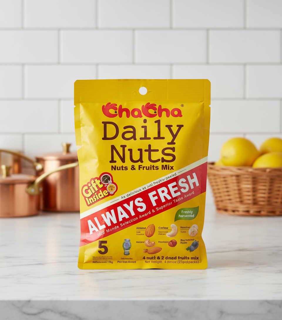 * **Nutritious Blend:** A balanced mix of high-quality nuts and dried fruits for a healthy daily snack. * **Guaranteed Freshness:** Labeled as ‘Always Fresh’ to ensure a crunchy and flavorful experience in every bite. * **Convenient Packaging:** Perfect for on-the-go snacking, school lunches, or a quick energy boost during the day. * **Bonus Gift Included:** Every bag comes with a surprise ‘Gift Inside,’ making it a fun treat for all ages. * **Trusted Quality:** From the reputable brand ChaCha, known for delivering high-quality and delicious snack products.