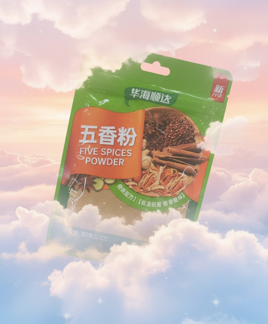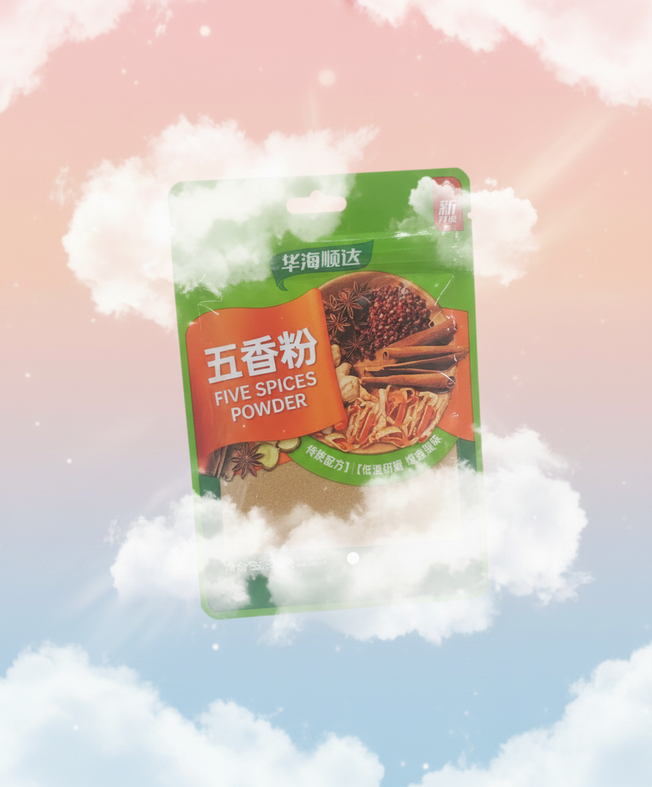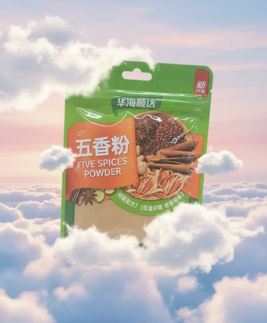 * **Essential Chinese Spice:** A staple aromatic seasoning blend used extensively in traditional Chinese and Asian cooking. * **Perfect Spice Balance:** A harmonious mixture of five key spices, typically including star anise, cloves, cinnamon, Sichuan pepper, and fennel seeds. * **Versatile Culinary Use:** Ideal for marinating meats like pork and duck, seasoning stir-fry dishes, or adding depth to stews and braises. * **Aromatic Flavor Profile:** Delivers a complex balance of sweet, sour, bitter, pungent, and salty notes to any dish. * **Convenient Packaging:** Comes in a moisture-proof pouch designed to preserve the freshness and intense aroma of the ground spices.