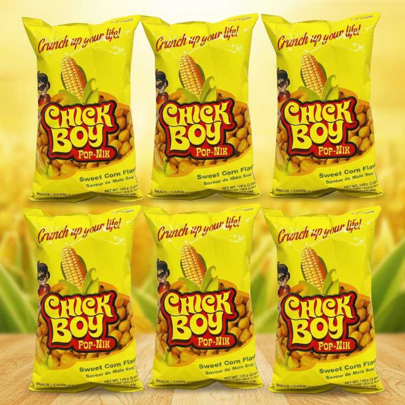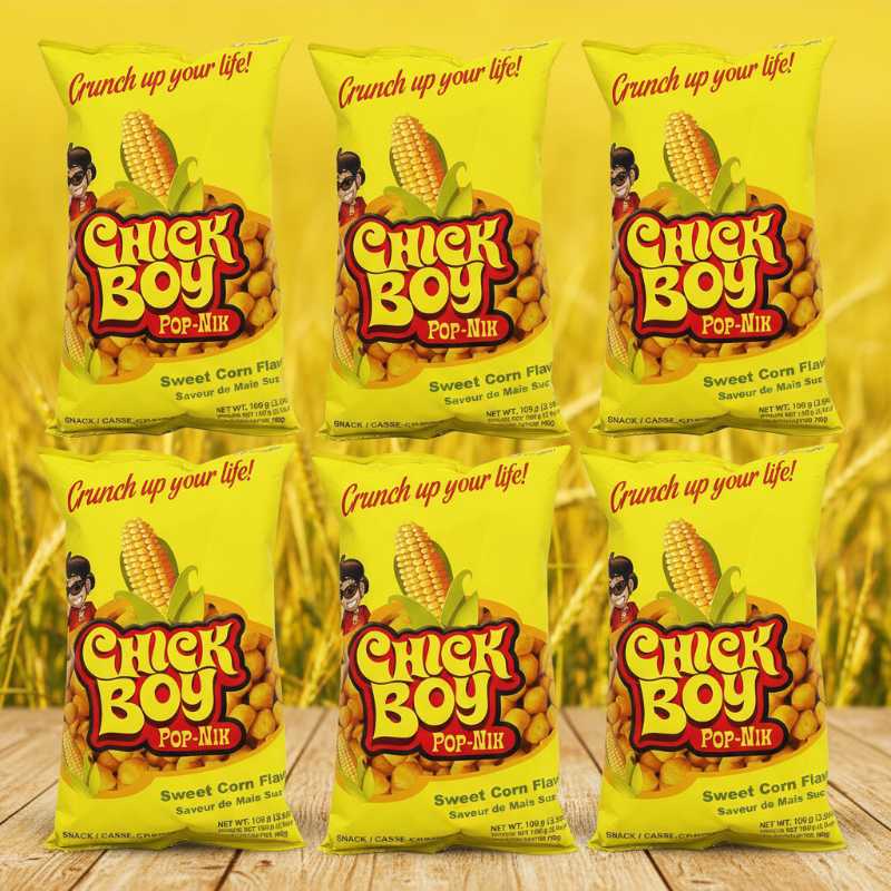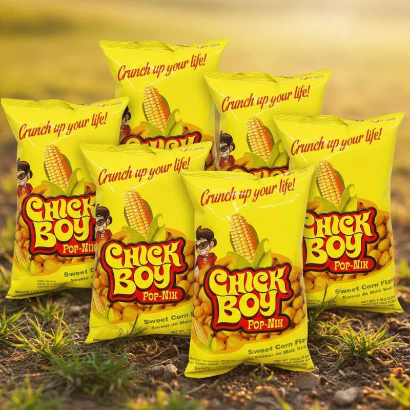 * **Brand:** Chuck Boy * **Product:** Pop-Nik * **Flavor:** Sweet Corn Flavor * **Type:** Crunchy Toasted Corn Kernels Snack * **Packaging:** Bright yellow bag with cartoon graphics * **Perfect for:** Snacking, movie nights, parties, or on-the-go treats * **Texture:** Satisfyingly crunchy