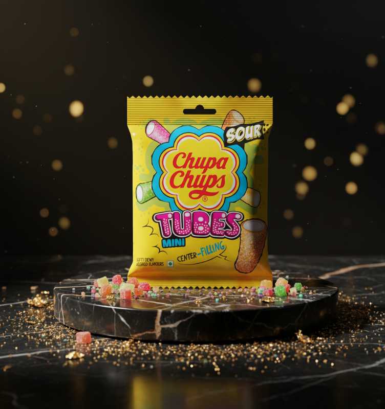 * **Brand:** Iconic Chupa Chups quality and taste. * **Product Type:** Sour Mini Tubes gummy candies. * **Flavor & Texture:** A perfect balance of sour coating and a sweet, soft center filling. * **Unique Shape:** Fun, bite-sized cylindrical tube shape for an enjoyable chewing experience. * **Vibrant Packaging:** Eye-catching yellow bag, ideal for on-the-go snacking or sharing.