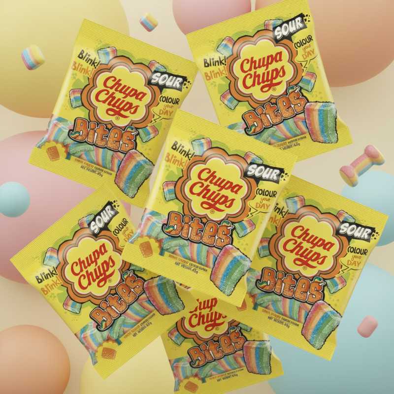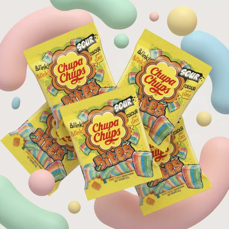 * ## Chupa Chups Sour Rainbow Bites * **Intense Sour Flavor:** Features a strong, tart coating for a thrilling taste experience. * **Vibrant Rainbow Stripes:** Each piece showcases bright, colorful stripes that visually appeal and ‘colour your day’. * **Chewy Texture:** Soft, satisfying gummy/chewy candy pieces in a convenient bite size. * **Snack Pack:** Comes in a handy 45g pouch, perfect for on-the-go enjoyment, movie nights, or lunch boxes. * **Authentic Chupa Chups:** A fun and playful candy offering from the globally recognized brand.