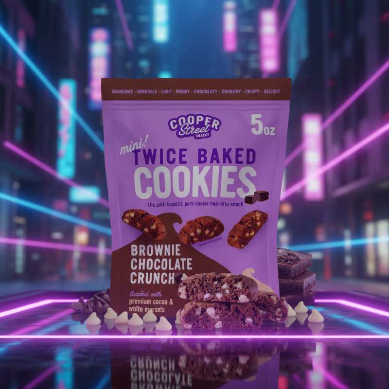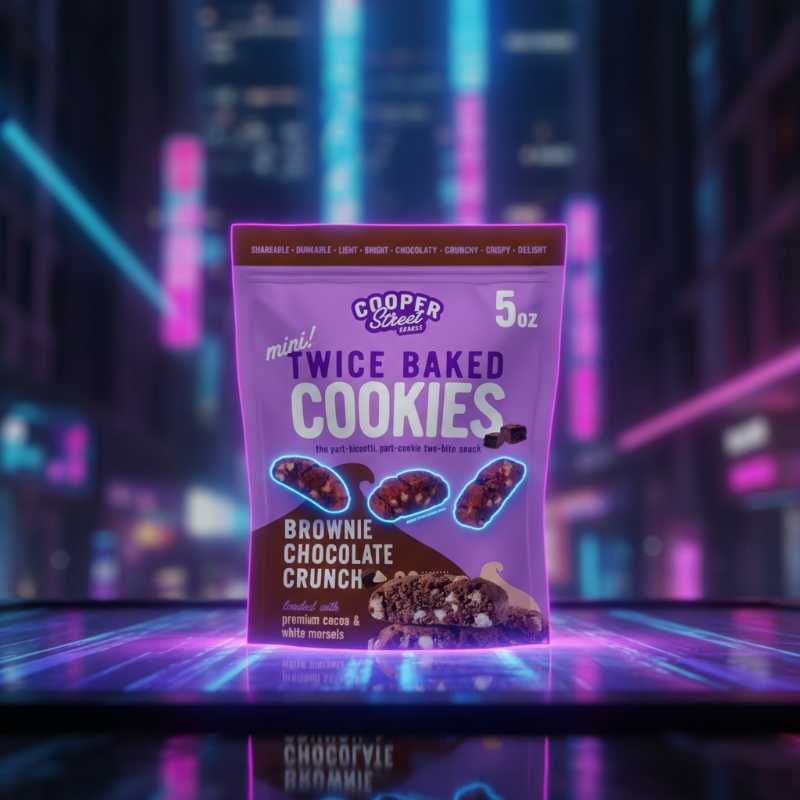 * Mini Twice Baked Cookies for an extra crunchy, satisfying bite. * Rich Brownie Chocolate Crunch flavor profile. * Baked with premium cocoa and loaded with white morsels and chocolate chunks. * Bite-sized format makes them perfect for snacking, dipping in coffee, or pairing with ice cream. * Comes in a convenient 5 oz resealable pouch to maintain freshness.