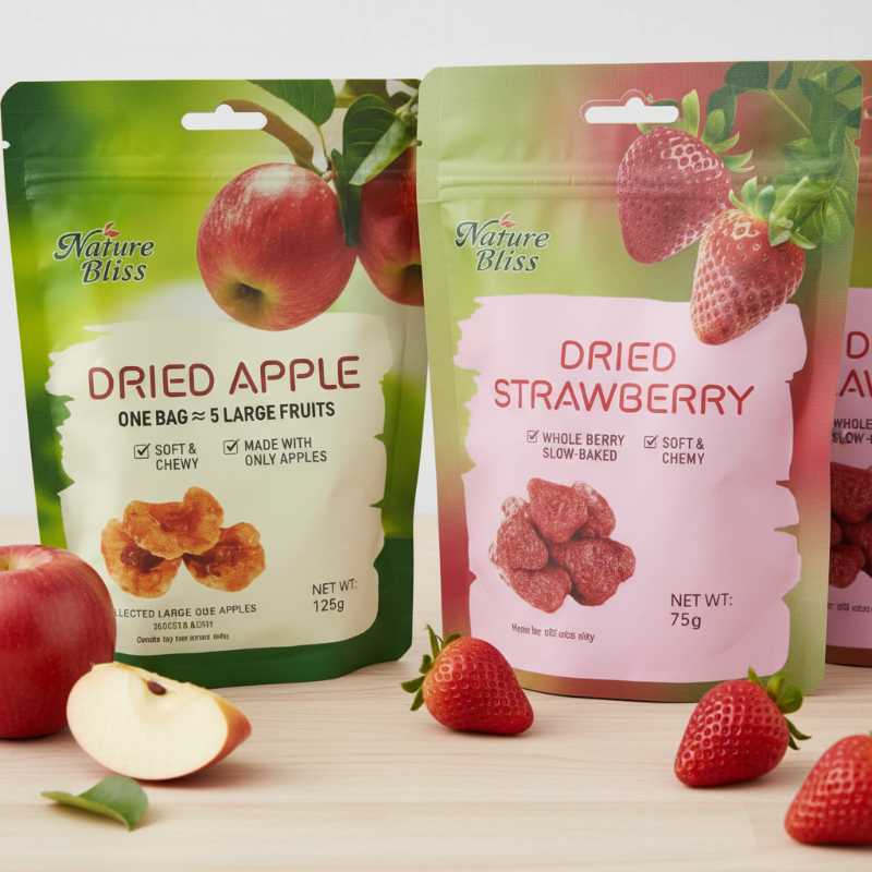 * **Two Delicious Varieties:** Enjoy the natural sweetness of Dried Apple and the tangy flavor of Dried Strawberry. * **Healthy Snacking:** A wholesome alternative to sugary treats, perfect for guilt-free indulgence. * **Natural Fruit Goodness:** Made from real fruit, offering a convenient way to boost your daily fruit intake. * **On-the-Go Convenience:** Packaged in resealable pouches, ideal for lunchboxes, travel, or a quick snack anytime, anywhere. * **Versatile Use:** Great for direct snacking, adding to cereals, yogurts, trail mixes, or baking recipes. * **Sweet & Chewy Texture:** Satisfies cravings with a delightful texture and concentrated fruit flavor.