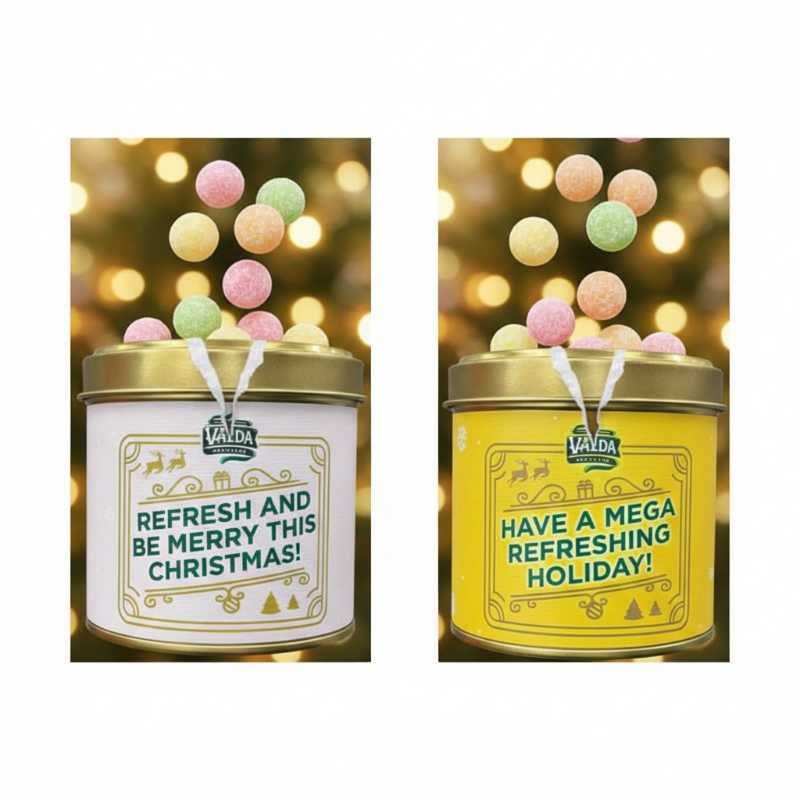 * Festive Messages: Yellow tin features “HAVE A MEGA REFRESHING HOLIDAY!” and the white tin states “REFRESH AND BE MERRY THIS CHRISTMAS!”