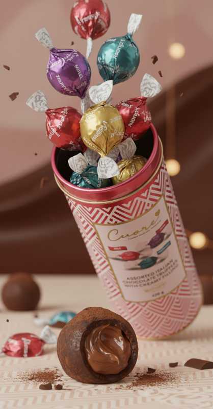 * Authentic Imported Italian Chocolate Truffles * Features a rich, indulgent creamy filling * Net Weight: 430 grams (approximately 15.17 oz) * Packaged in an elegant, reusable decorative pink tin with a geometric pattern * Ideal for gifting, holidays, special occasions, or personal enjoyment