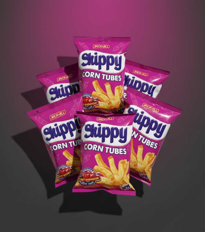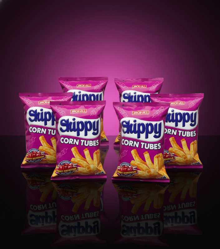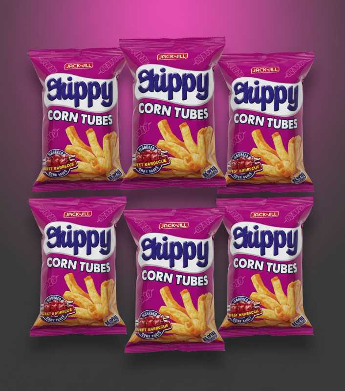 * **Brand:** Jack ‘n Jill * **Product Name:** Skippy Corn Tubes * **Flavor:** Sweet Barbecue * **Type:** Crispy, corn-based snack tubes * **Packaging:** Distinctive pink/magenta bag with bold lettering and product imagery