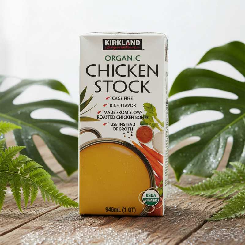 * **Kirkland Signature** Organic Chicken Stock * Made with **Cage Free** chicken ingredients * Features a **Rich Flavor** for culinary excellence * Certified **USDA Organic** * Ideal substitute for water or broth in recipes * Convenient 946 mL (1 Quart) carton