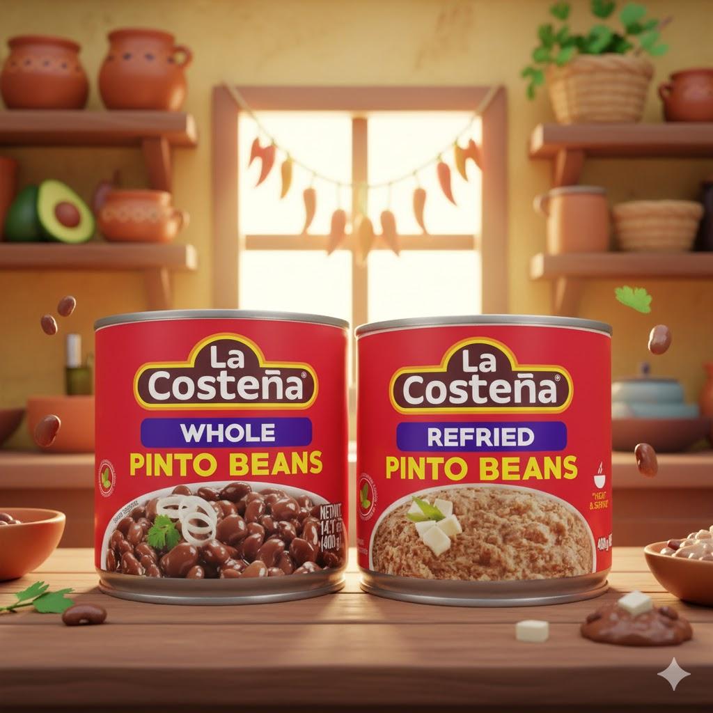 - Refried Pinto Beans (400g) – Smooth and creamy beans with a rich, authentic flavor, perfect for burritos, tacos, or dips.