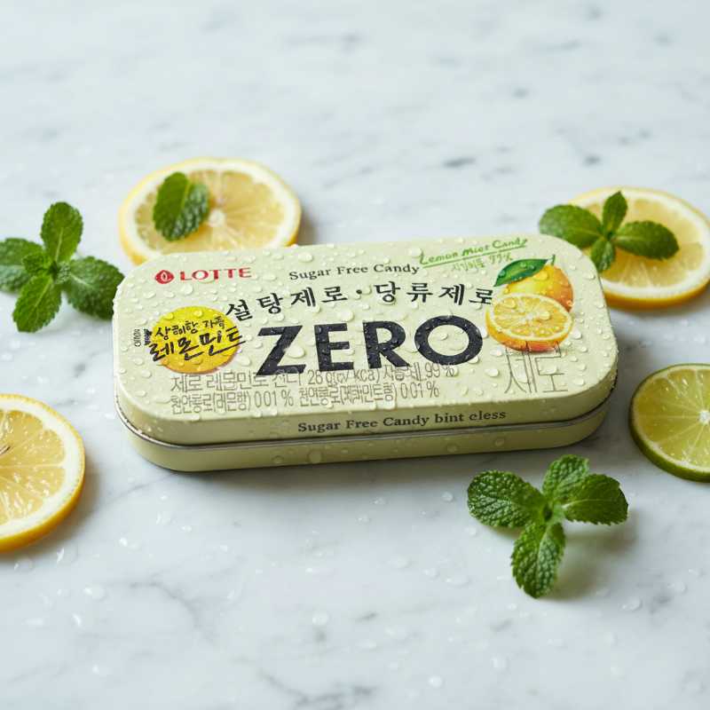 * ### Product Features: * **Brand & Line:** Authentic LOTTE ZERO product from Korea. * **Zero Sugar:** Completely sugar-free (설탕제로) and uses zero carbohydrates/sweeteners (당류제로). * **Refreshing Flavor:** Combines zesty lemon notes with a cool mint finish. * **Guilt-Free Treat:** Ideal for individuals managing sugar intake, including diabetics or those on low-carb diets. * **Product Type:** Hard candy/mints packaged in a convenient tin.
