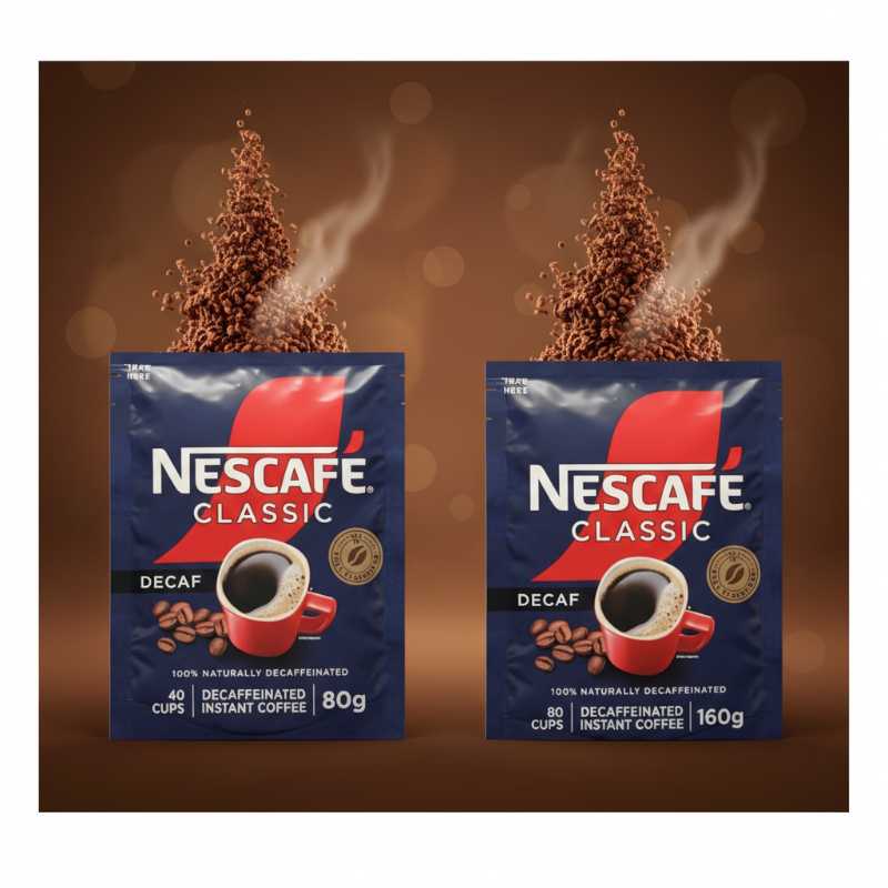 * **NESCAFÉ Classic Decaf Instant Coffee:** Enjoy the rich and smooth flavor of NESCAFÉ without the caffeine. * **100% Naturally Decaffeinated:** Made using a natural process to remove caffeine while preserving the true coffee taste. * **Generous Size:** 80g refill pouch, offering approximately 40 servings or cups of coffee. * **Convenient Refill Packaging:** Ideal for restocking your coffee jar or easy storage.