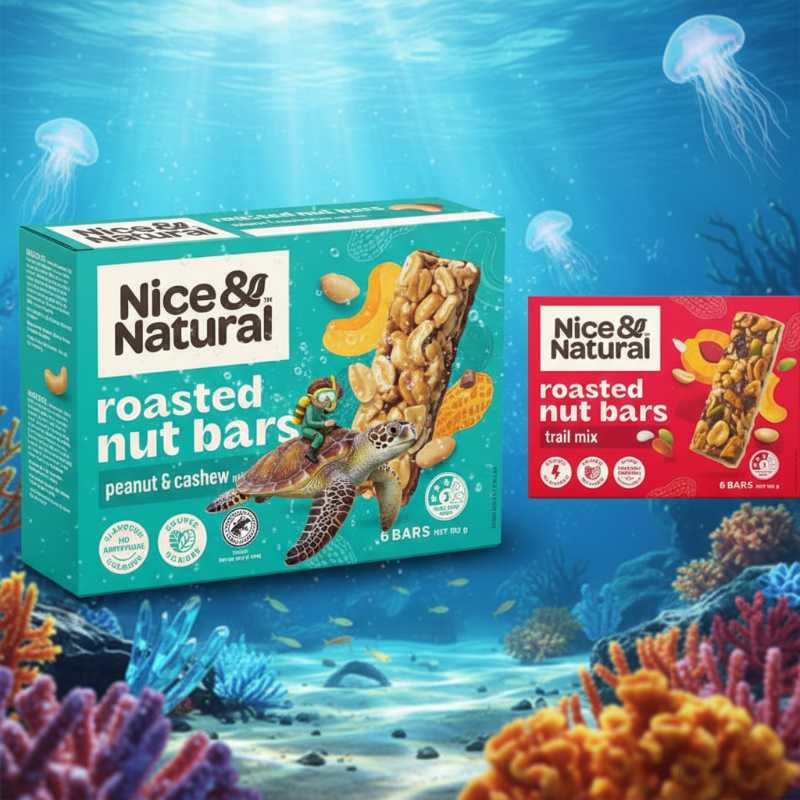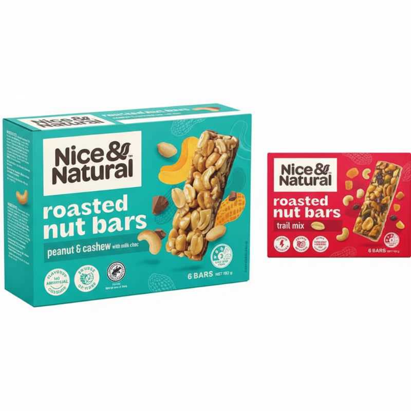 * **Brand:** Nice & Natural * **Product Type:** Roasted Nut Bars * **Flavor Profile:** Features a blend of Peanut & Cashew * **Pack Size:** Convenient 6-bar multipack * **Nutritional Benefit:** A good source of Fiber and Protein * **Quality Guarantee:** Contains No Artificial Colours or Flavours * **Preparation:** Oven Roasted for a rich, crunchy texture