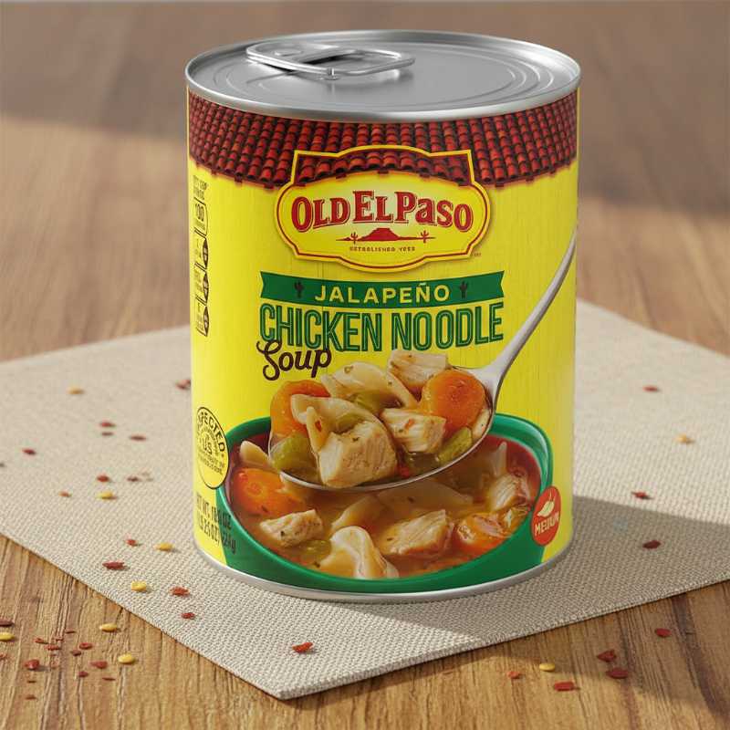 * **Brand:** Old El Paso * **Flavor:** Zesty Jalapeño Chicken Noodle * **Format:** Convenient ready-to-serve canned soup * **Ingredients:** Contains tender chicken pieces, classic noodles, and vegetables * **Taste Profile:** Offers a delightful spicy kick to the comforting taste of chicken noodle soup * **Meal Idea:** Ideal for a quick lunch, light dinner, or a warming snack