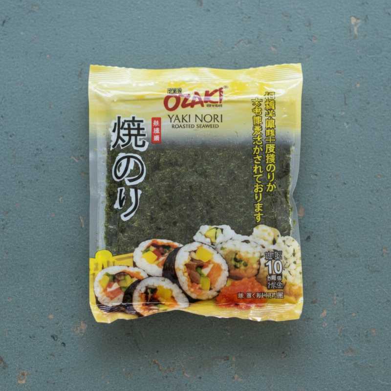 * **Brand:** Ozaki * **Product Name:** Yaki Nori / Roasted Seaweed * **Primary Use:** Ideal for making sushi rolls (maki), onigiri, or as a garnish for various dishes. * **Type:** Roasted seaweed sheets, providing a crisp texture and savory umami flavor. * **Origin:** Japanese style seaweed. * **Versatility:** Can be enjoyed as a healthy snack or crushed to sprinkle over salads and soups.