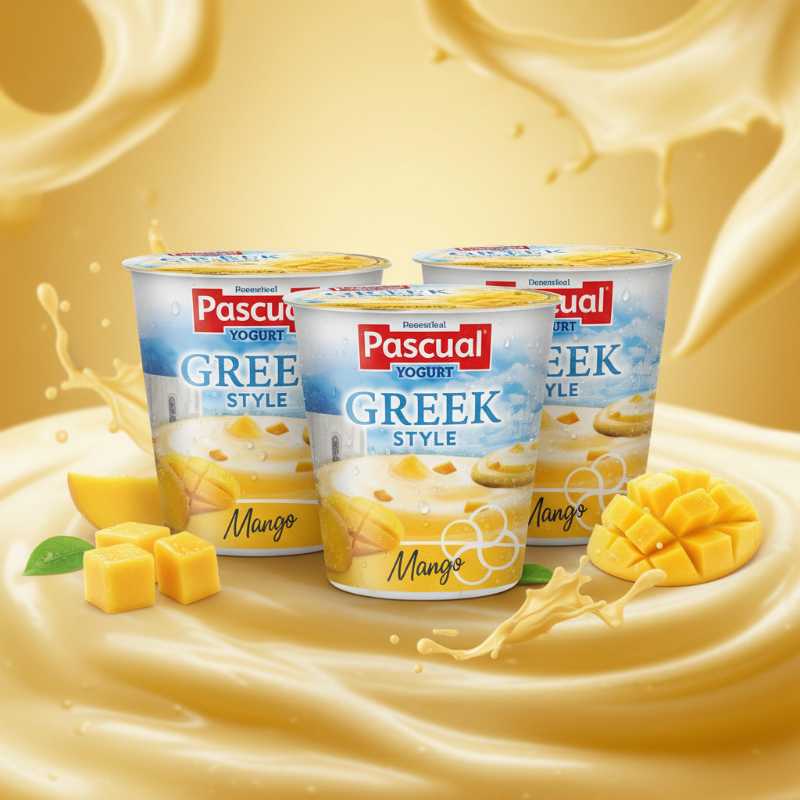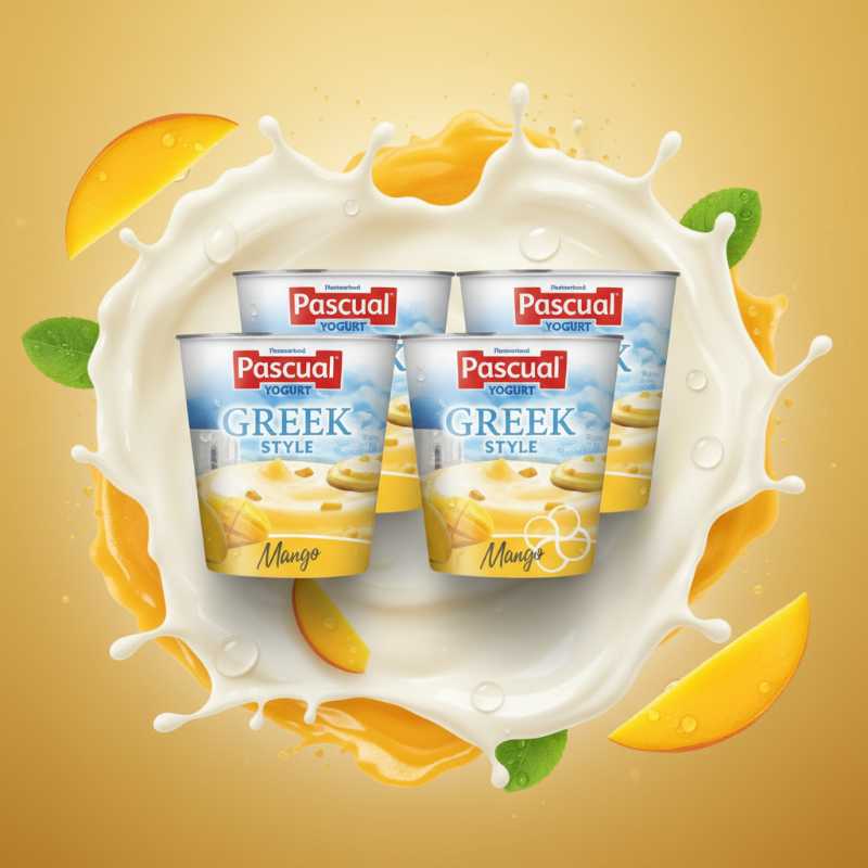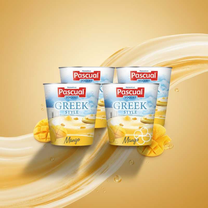 * **Brand:** Pascual * **Product:** Greek Style Yogurt * **Flavor:** Delicious Mango * **Quantity:** Convenient 5-pack * **Format:** Individual serving cups, perfect for on-the-go * **Texture:** Creamy and rich Greek style yogurt