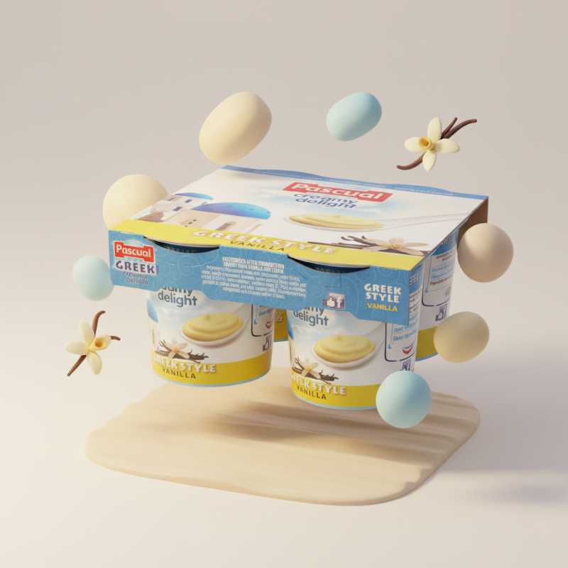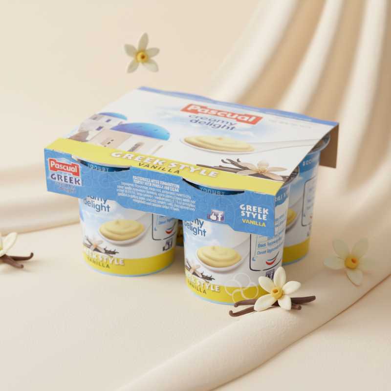 * **Brand:** Pascual * **Product:** Greek Yummy Delight Yogurt * **Flavor:** Rich and creamy Vanilla * **Pack Size:** Convenient 4-pack of individual cups * **Style:** Authentic Greek Style yogurt * **Texture:** Indulge in a smooth, creamy delight * **Versatile:** Perfect for breakfast, snacks, or dessert