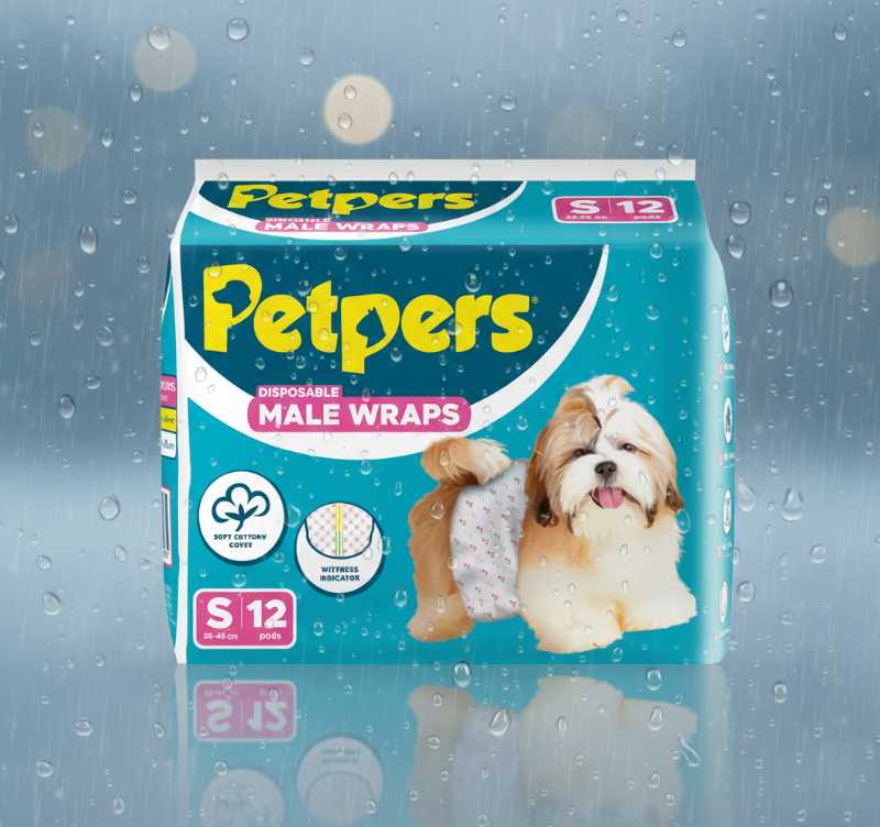 * **Brand:** Petpers * **Product Type:** Disposable Male Dog Wraps / Belly Bands * **Size:** Small (S) * **Quantity:** 12 wraps per pack * **Designed For:** Male dogs, providing effective protection against incontinence, marking, and during training. * **Key Features:** High absorbency and comfortable fit, indicated by cotton and absorbency icons on the packaging. * **Convenience:** Disposable for easy cleanup and hygiene.
