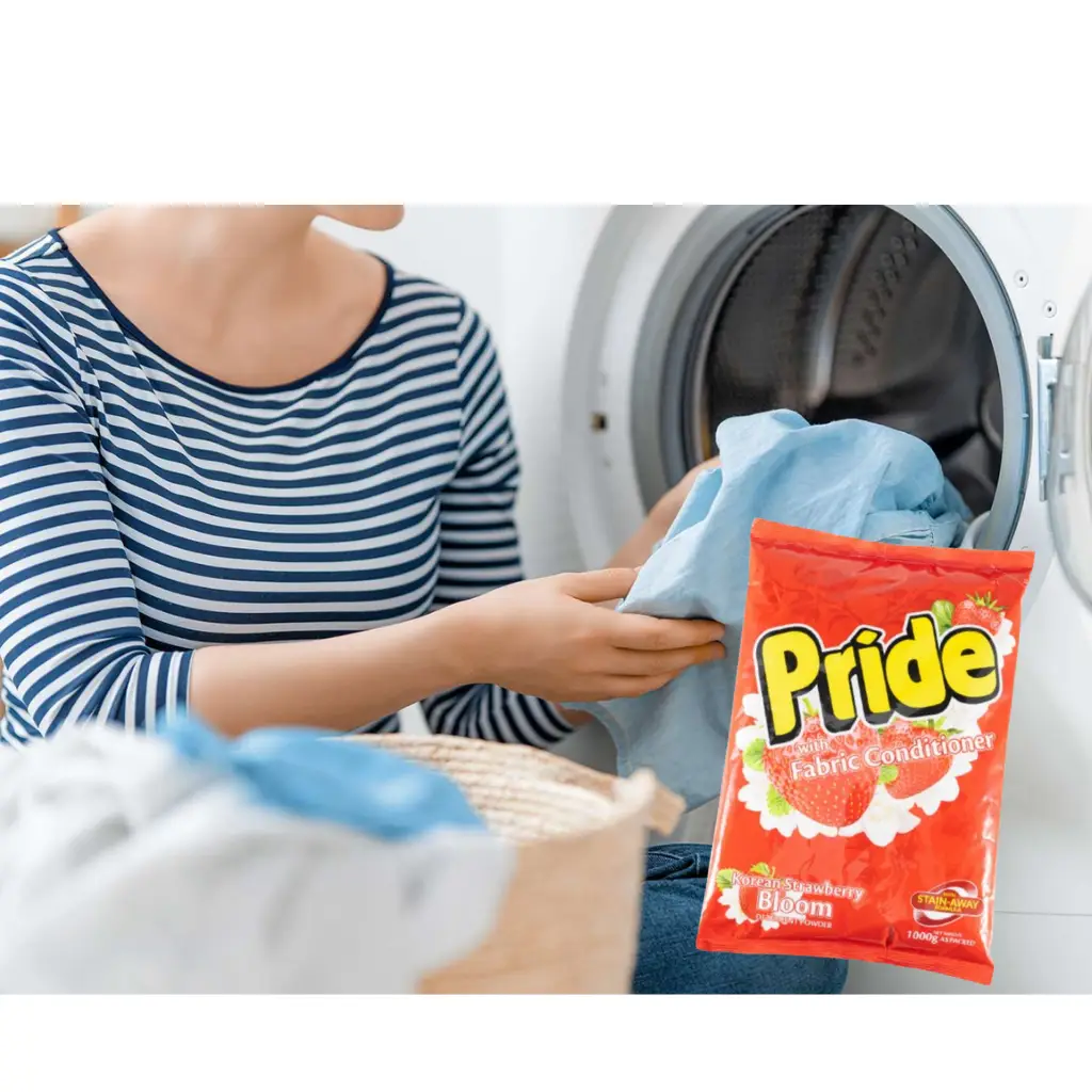 Pride With Fabric Conditioner Korean Strawberry Bloom Stain Away" is a fabric softener with a unique blend of floral and fruity scents. The "Korean Strawberry Bloom" fragrance evokes the essence of fresh, sweet strawberries combined with soft floral notes, offering a pleasant and long-lasting scent to your laundry. The "Stain Away" feature helps to protect clothes from stains, offering a gentle yet effective cleaning boost, making your fabrics feel soft and fresh. It’s designed to keep clothes looking and smelling fresh, while maintaining their quality and texture after every wash.