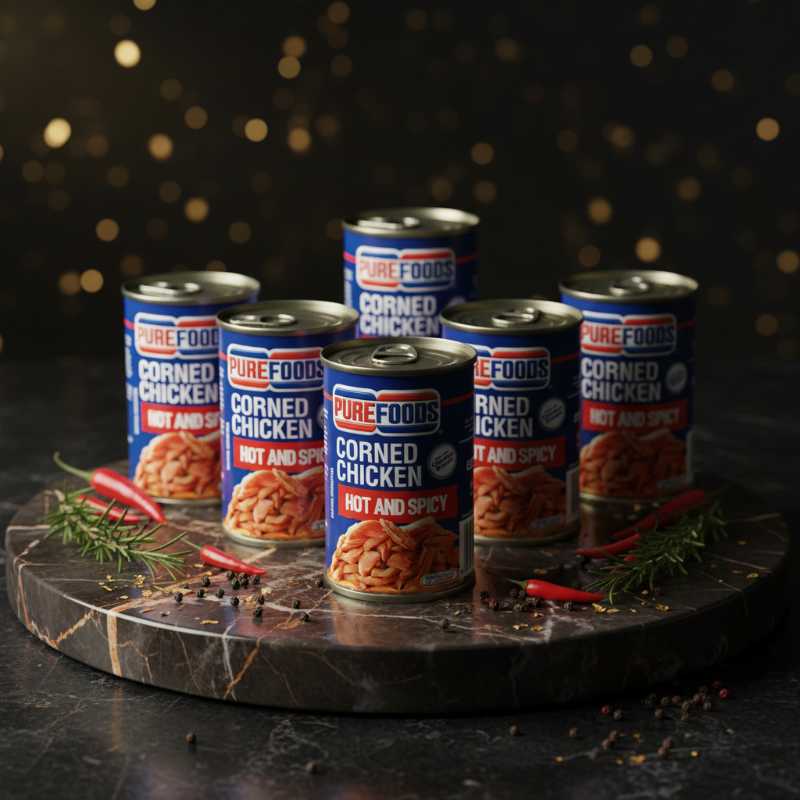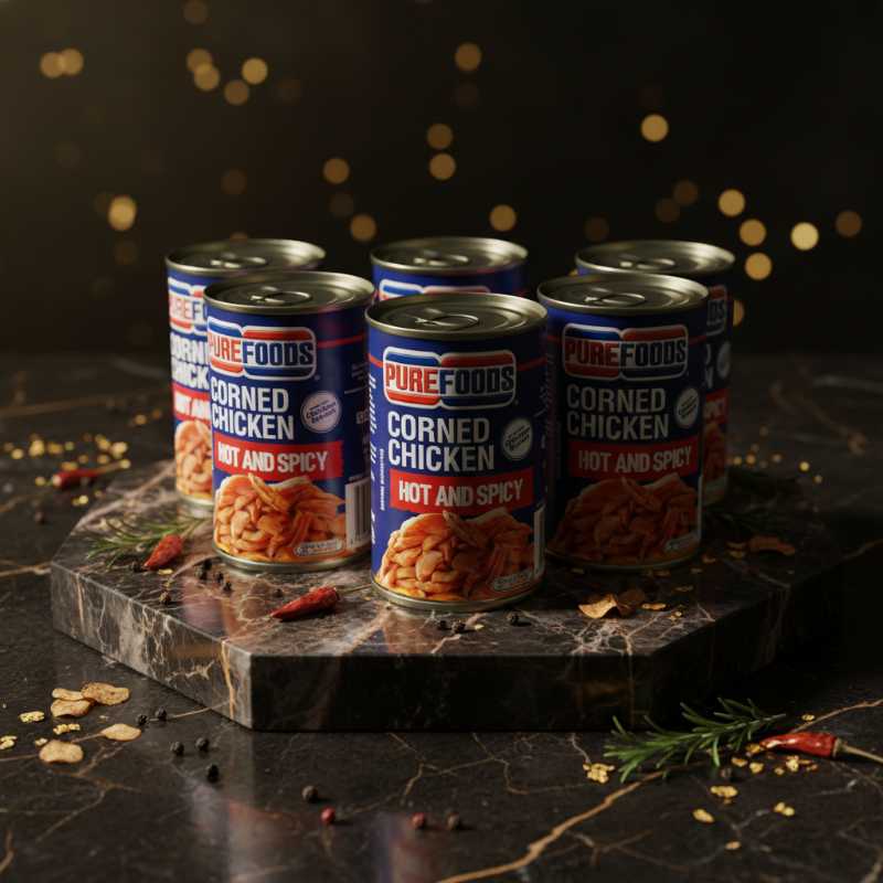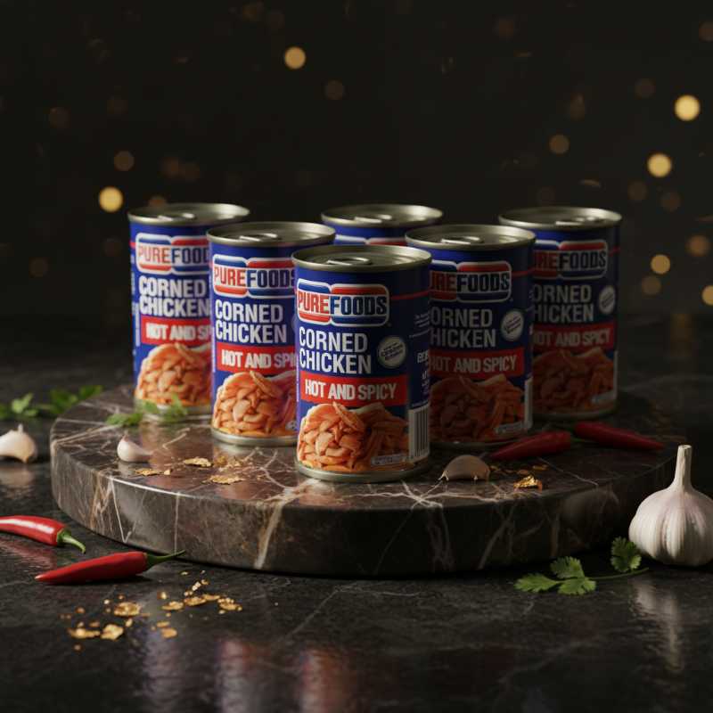 * **Brand:** Purefoods * **Product Type:** Corned Chicken * **Flavor:** Hot and Spicy * **Format:** Canned for convenience and long shelf life * **Texture:** Features tender chicken chunks * **Versatility:** Perfect for quick meals, sandwiches, rice toppings, or adding a spicy kick to recipes * **Ready-to-Eat:** A convenient option for busy individuals or emergency food supplies