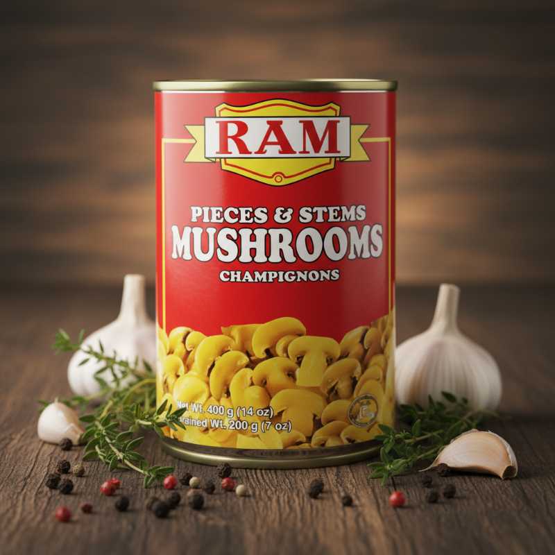 * **Brand:** RAM * **Product Type:** Mushrooms * **Form:** Pieces & Stems * **Variety:** Champignons (White Button Mushrooms) * **Packaging:** Convenient Canned Format * **Net Weight:** 400g (14.1 oz) * **Drained Weight:** 200g (7.0 oz) * **Ready-to-Use:** Ideal for cooking, stir-fries, sauces, pizzas, and salads * **Storage:** Shelf-stable for easy pantry stocking