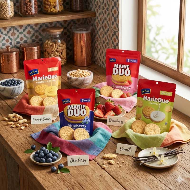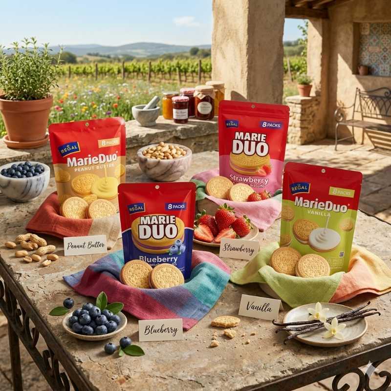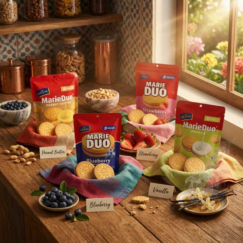 Regal Marie Duo Sandwich Biscuit 160g 8pcs per sachet – Chocolate|Blueberry|Vanilla|Strawberry