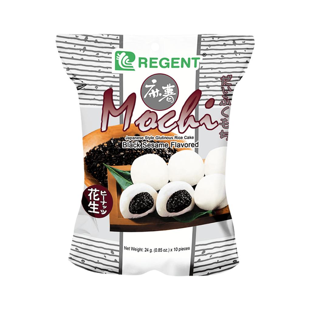 - Mochi Black Sesame is a Japanese Style black sesame flavored glutinous rice cakes that is white in color with sweet black sesame flavored mung beans filling. It comes with 10 pcs per pack.