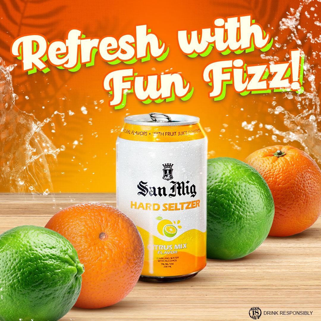 San Mig Hard Seltzer, is a naturally fruit-flavored sparkling water with alcohol content of 5%. It has just the right sweetness, without lingering bitterness that makes it easy-to-drink. It is available in citrus mix flavor which offers a fusion of orange and dalandan zests that results in a light and refreshing drink. In addition to the pleasant mouthfeel, it has low calories, zero sugar, and no preservatives.
