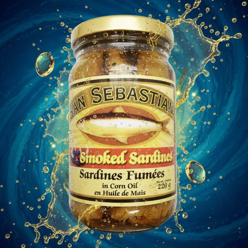 * ### San Sebastian Smoked Sardines Features: * **Premium Quality:** San Sebastian brand smoked sardines (Sardines Fumées) preserved in oil. * **Preparation:** Packed in light Corn Oil (Huile de Maïs) to enhance flavor and texture. * **Rich Smoky Flavor:** Features a distinctive, robust smoky profile, ideal for gourmet snacking or appetizers. * **Nutritional Benefits:** Sardines are a natural source of protein and essential Omega-3 fatty acids. * **Convenient Packaging:** Stored in a sturdy, reusable 220g glass jar for freshness and visibility.
