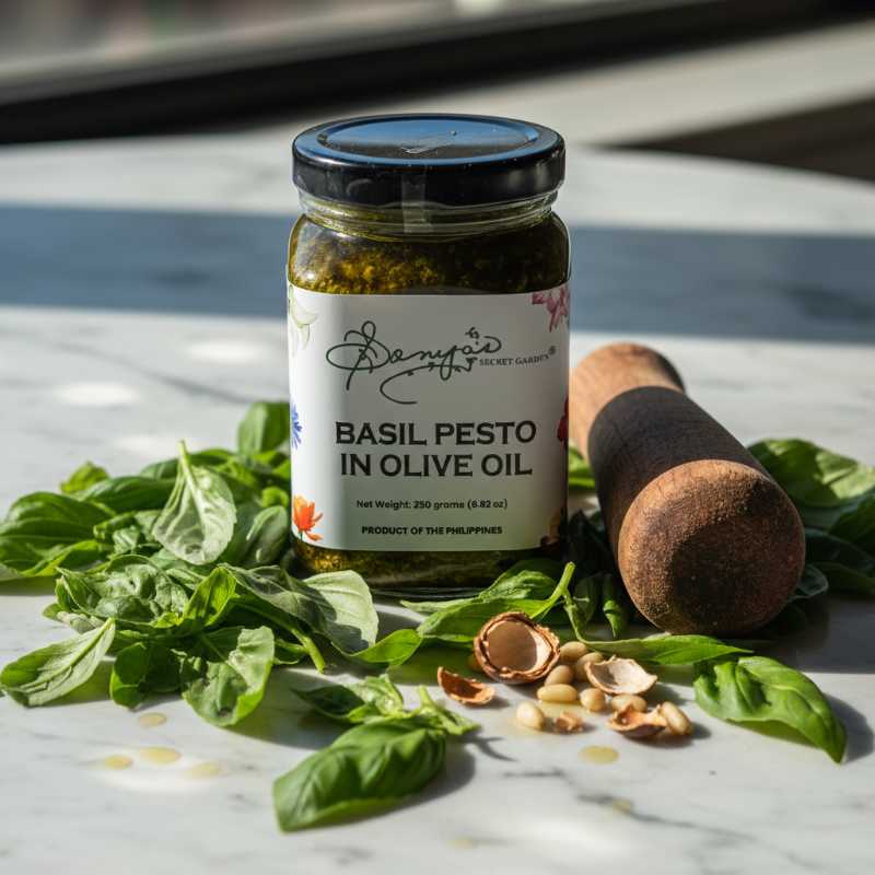 - Authentic Basil Pesto expertly preserved in quality Olive Oil.