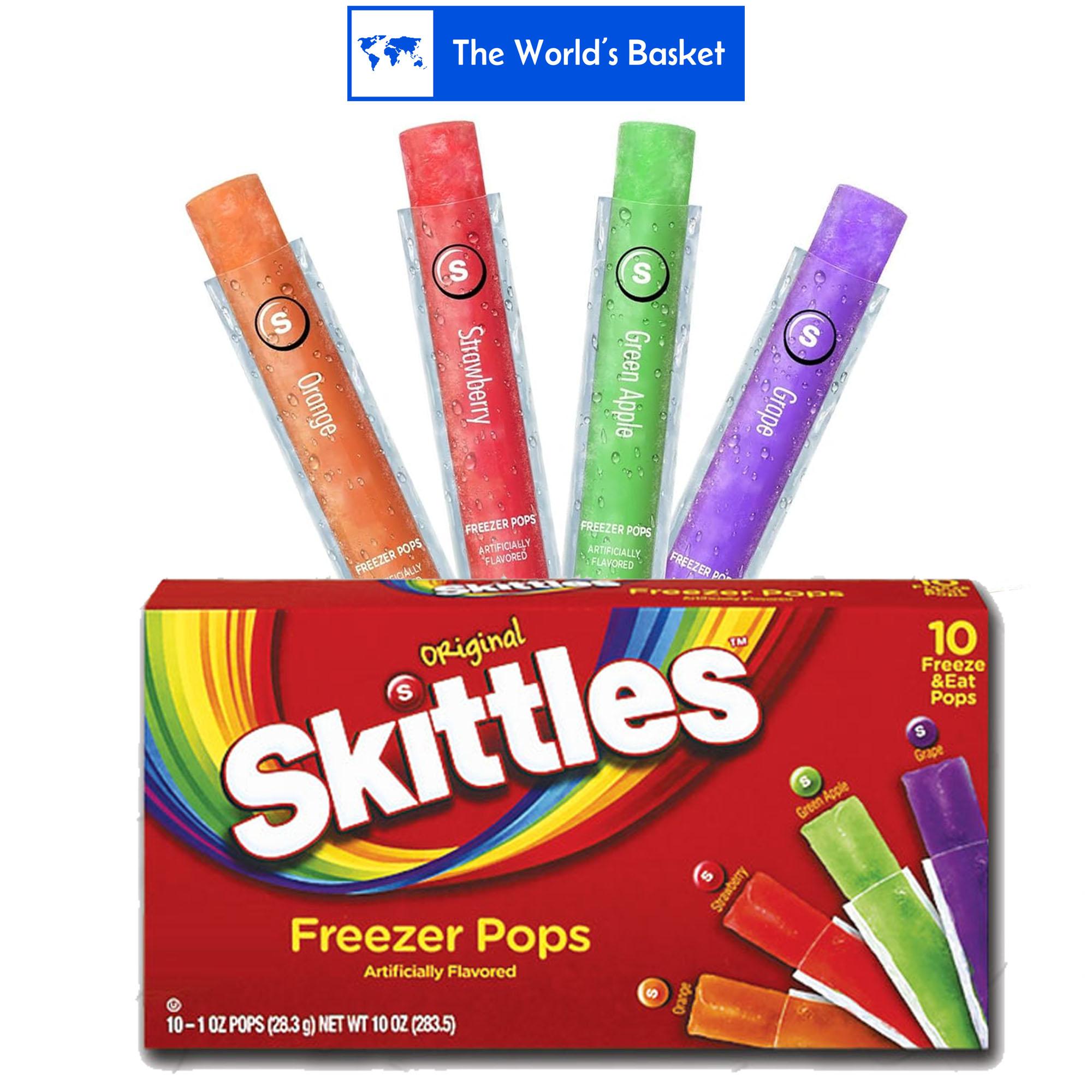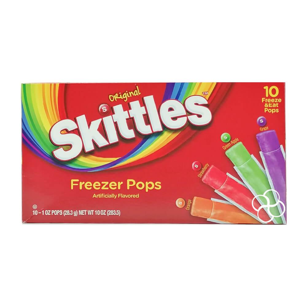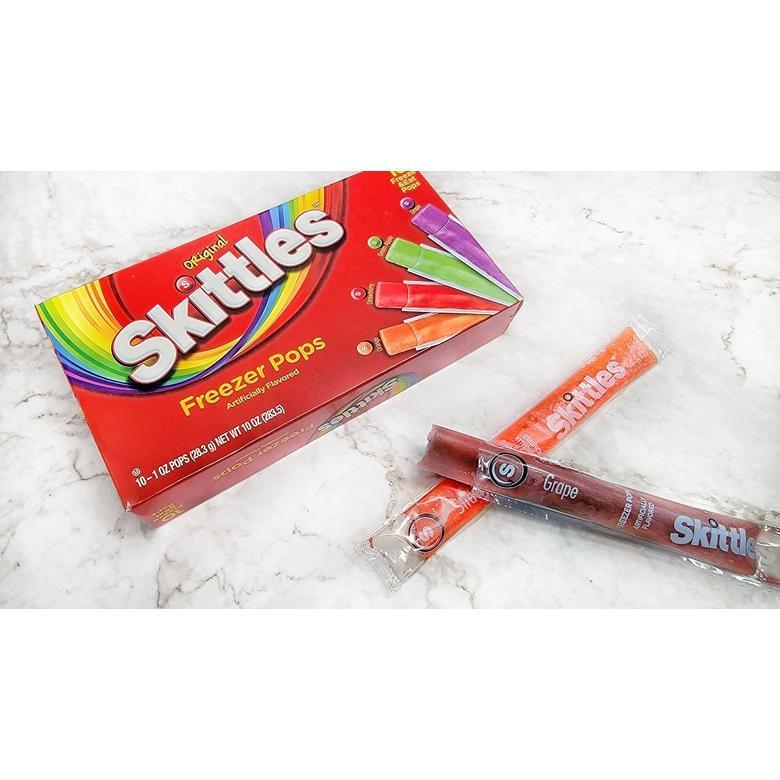 Introducing Skittles freezer pops! The candy Flavors you love in a freezable confection. Contains 10 freezer pops in 5 amazing Skittles flavors: Strawberry, Orange, green apple, lemon, and grape. Throw them in the freezer for a bit and then enjoy a nice, frozen treat! Freeze the Rainbow! Taste the Rainbow!