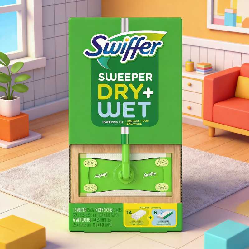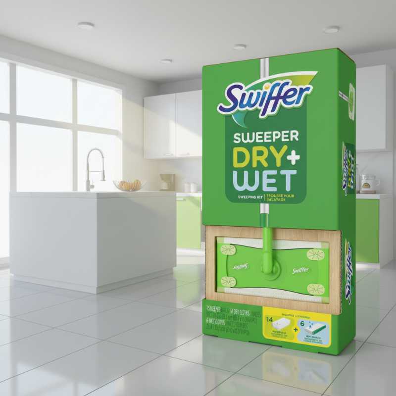 * **2-in-1 Cleaning Tool:** Versatile design allows you to use it as a broom with dry cloths or a mop with wet cloths for a complete floor clean. * **Complete Starter Kit:** Includes 1 Swiffer Sweeper device, 14 dry sweeping refills, and 6 wet mopping refills to get you started immediately. * **Trap + Lock Technology:** Dry cloths feature deep ridges to trap and lock dirt, dust, and hair, while wet cloths dissolve and trap tough messes. * **Multi-Surface Safe:** Safe to use on all finished floor types, including hardwood, tile, laminate, and vinyl. * **Lightweight & Easy to Use:** Features a swivel head that easily reaches into corners and under furniture for a thorough clean.