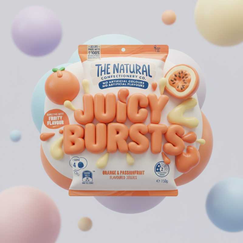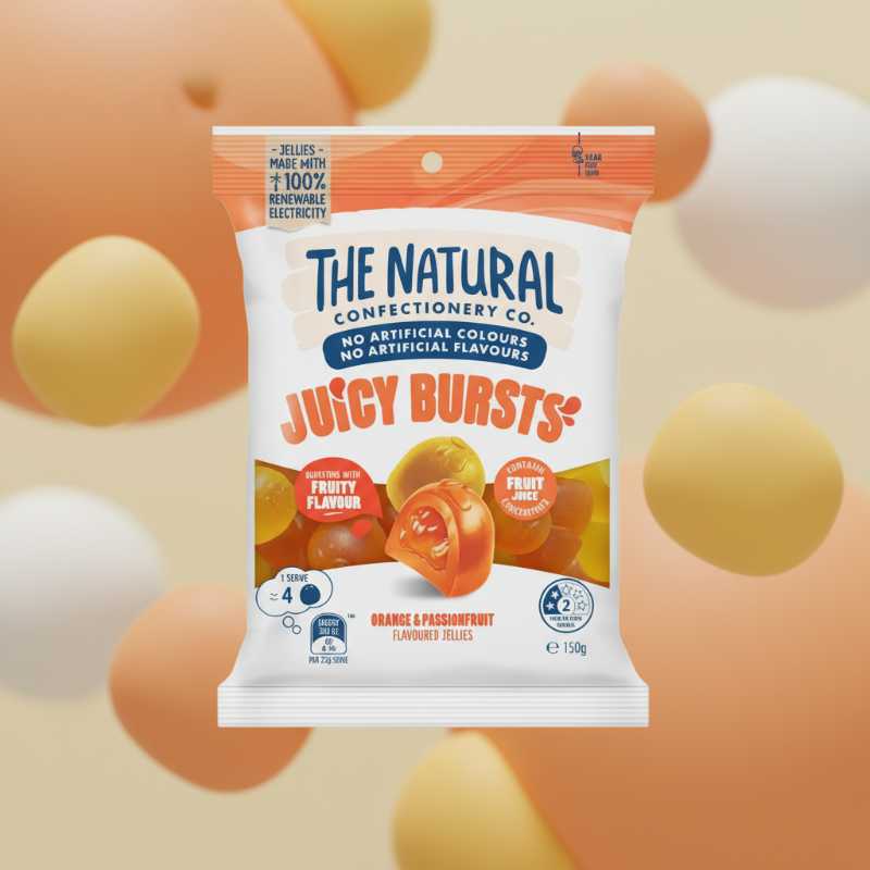 * ### Key Features: * **Brand:** The Natural Confectionery Co. * **Product:** Juicy Bursts chewy candies. * **Flavours:** Deliciously intense Orange & Passionfruit fruity flavour. * **Clean Ingredients:** Guaranteed No Artificial Colours and No Artificial Flavours. * **Weight:** Convenient 180g pouch size. * **Quality:** 100% Yummy Guaranteed.