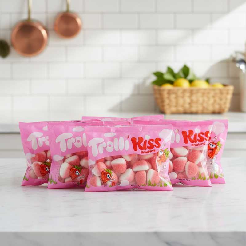 * **Sweet Strawberry Flavor:** Enjoy the classic taste of ripe strawberries in a soft, chewy gummy treat. * **Double-Layered Texture:** Combines a fruity strawberry gummy top with a soft, fluffy marshmallow-like base for a unique mouthfeel. * **Charming Shape:** These pink and white kiss-shaped candies are perfect for Valentine’s Day, parties, or everyday snacking. * **Convenient On-the-Go Pack:** Ideally sized for a quick snack, party favors, or sharing with friends. * **Trusted Brand:** Made by Trolli, a world leader in creating fun, innovative, and delicious gummy snacks.