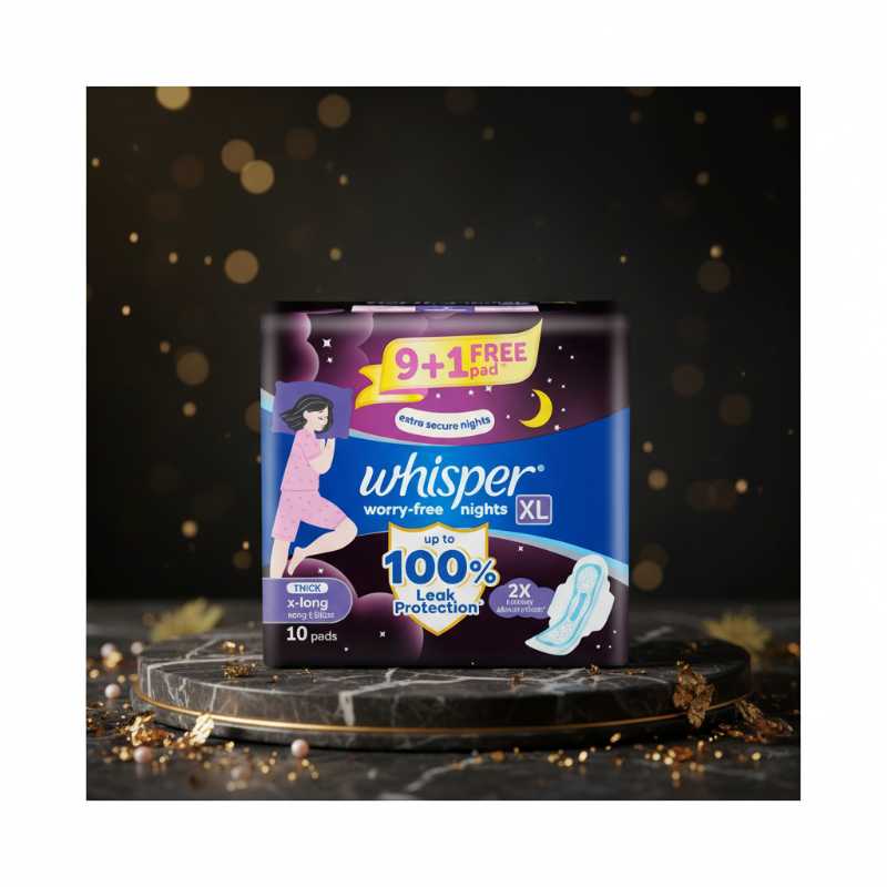 * **Brand:** Whisper * **Product Type:** Sanitary Pads / Sanitary Napkins * **Variant:** Worry-Free Nights * **Size:** XL (Extra Large) * **Quantity:** 10 pads (includes 9+1 Free offer) * **Protection:** Up to 100% Leak Protection * **Usage:** Specifically designed for overnight use and heavy flow nights * **Benefit:** Provides worry-free sleep with enhanced coverage